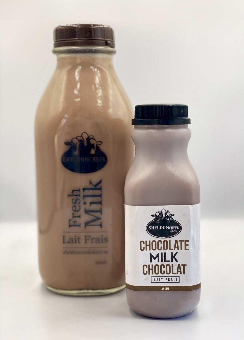 Sheldon Creek Dairy Chocolate Milk is offered in two sizes: 12 oz and 1 L.